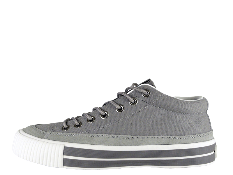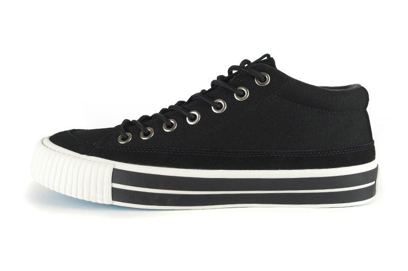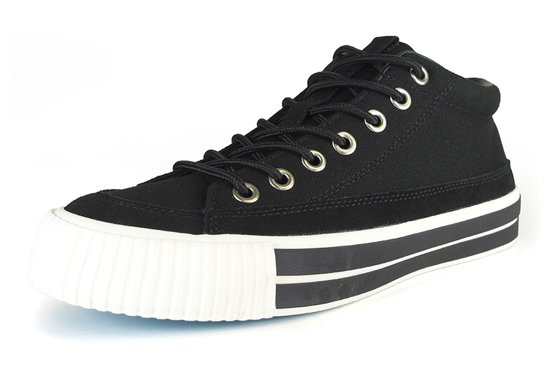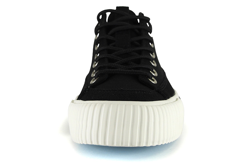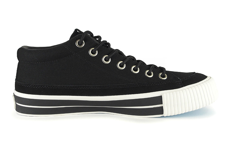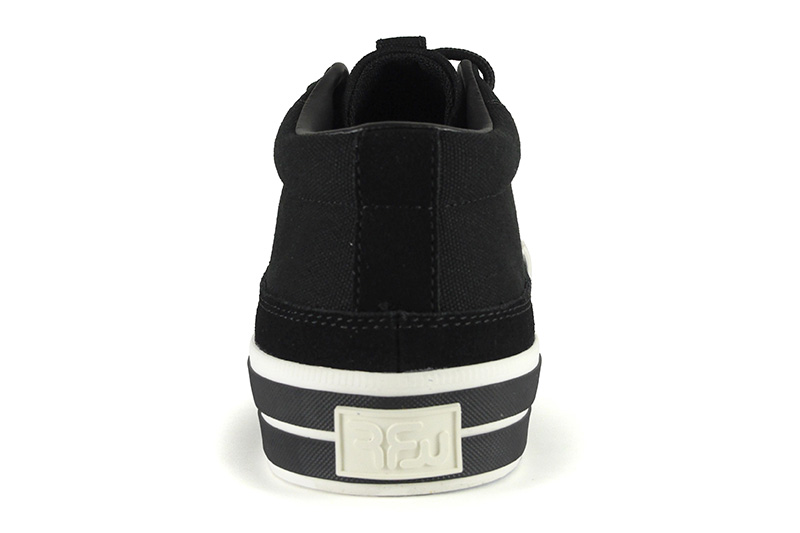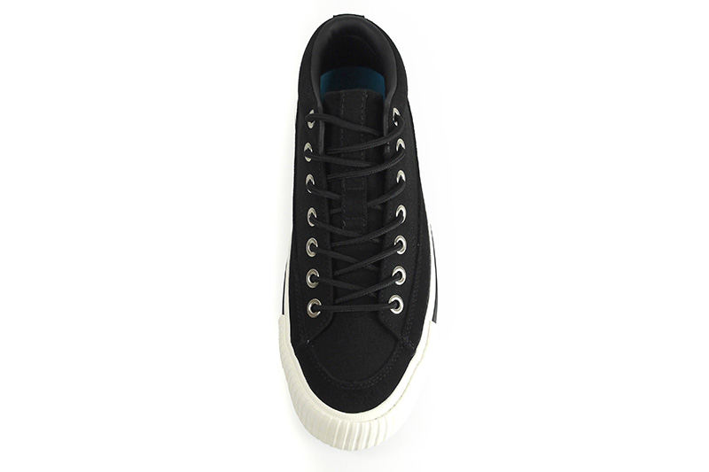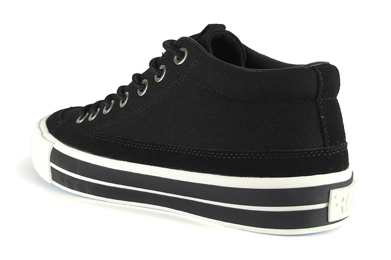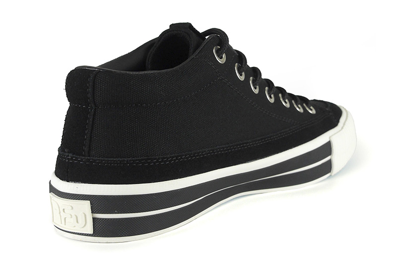 RFWを代表するモデルの一つBAGEL-MIDから初期に製作したキャンバス&スエードのモデル「STD」をアップデートさせました。BAGELの特徴であるミッドカットスニーカーはくるぶし丈で履き口がすっきりと作られており、シューレースを締めると足全体を優しくホールドしてくれます。履き口周りにはパッドが入っているので、フィット感は抜群です。またソールに配置した2本の太い黒いラインもポイントです。アウトソールはRFWのブランドカラーのシアンブルー(水色)になります。クッション性のあるPUインジェクションのカップインソールが足への負担を軽減し、快適な歩行をサポートします。アウトソールはしなやかながら耐久性の高いラバーソールになります。